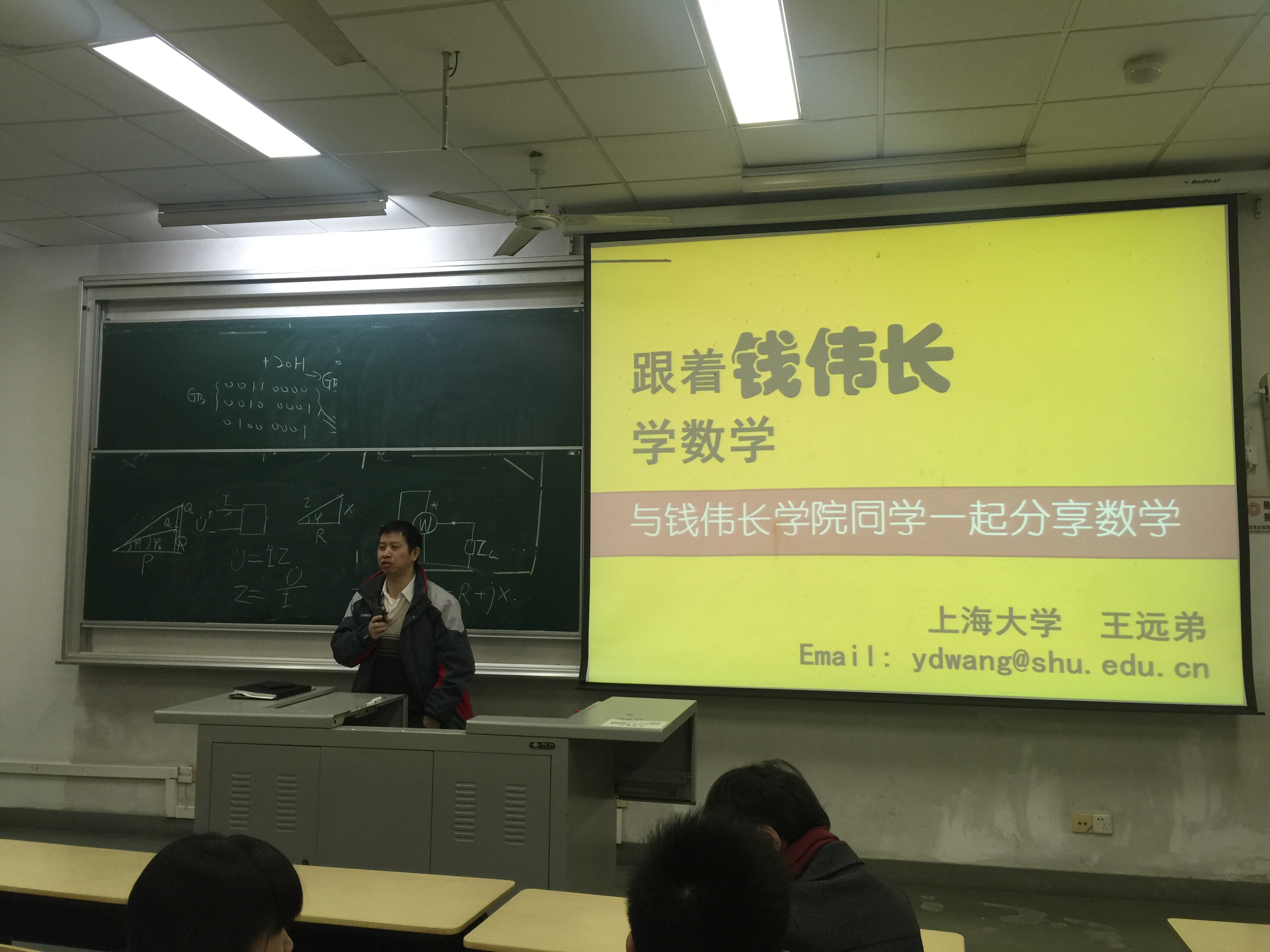 11月26日,永利yl23411科学研讨课系列报告顺利举行,永利yl23411财务处处长王远弟教授为同学们带来了题为"跟着钱伟长学数学——与永利yl23411的同学一起分享数学"的精彩报告。本次报告由永利yl23411副经理李颖洁教授主持,公司直属党总支副书记韦淑珍老师以及全体2015级本科生参加了本次报告活动。