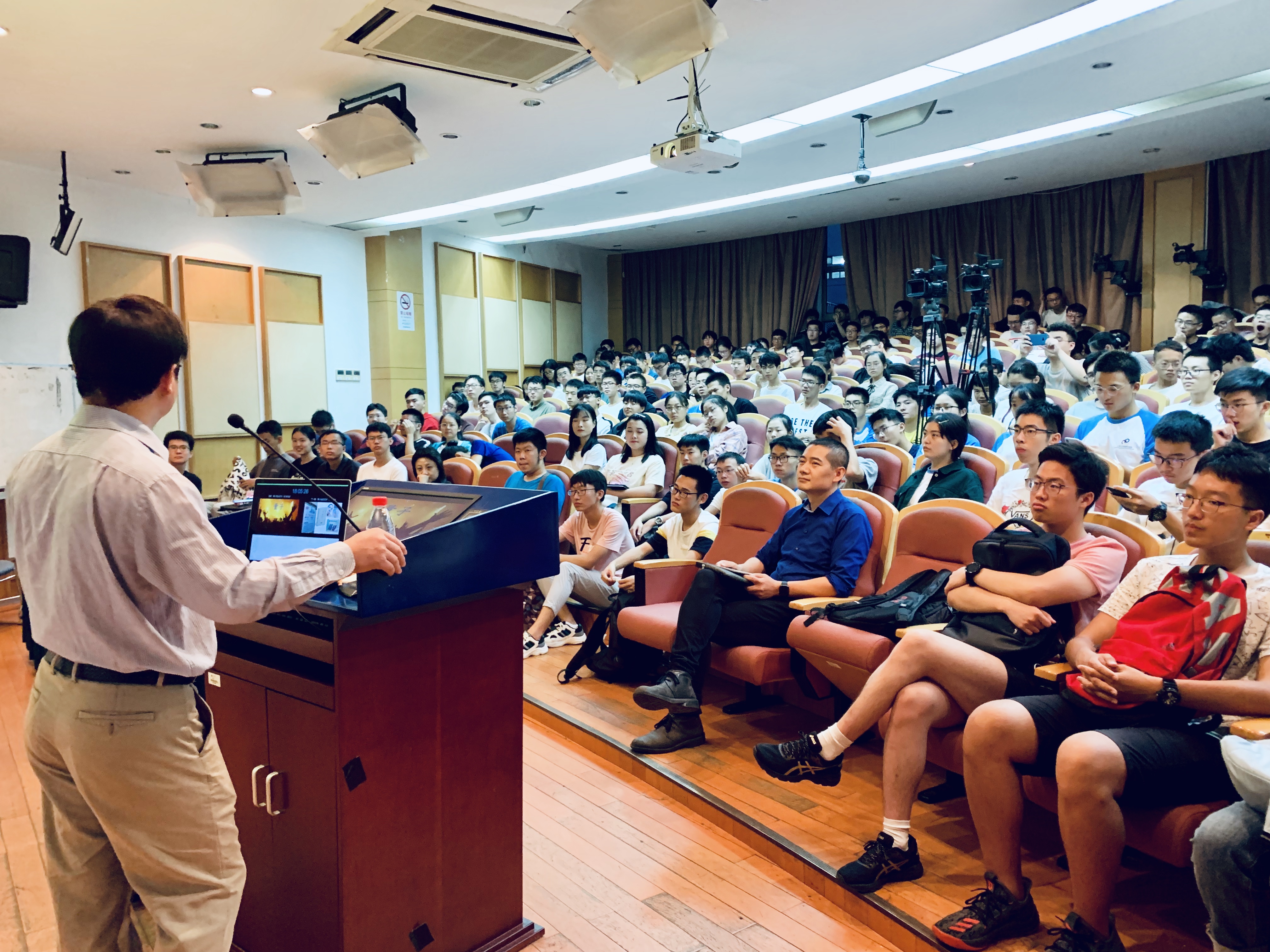 讲座开始前,公司员工代表向吴飙教授表达谢意并赠送钱伟长讲坛奖杯。接着吴飙教授从生活中一些常见的对量子概念的误区出发,向同学们阐述了量子的概念,引入话题。他介绍了"量子"这一物理专业名词在近5到10年流行起来的现况与原因,并对量子计算机改变人类生活和人类社会作了分析,介绍了薛定谔猫这一神奇的量子现象。之后以量子计算机和经典计算机的区别与联系为主线,详细介绍了量子计算机的发展历史,回顾了经典计算机的发展历程。说明了造量子计算机的背景与原因,他还讲述了量子计算机的发展现状,以及我们现在发展量子计算机的困难之处。吴教授总结了现代量子计算机的现状与发展,让同学们更清晰地了解认识量子计算机。随后姜颖教授对吴飙教授的讲座作了简要总结。