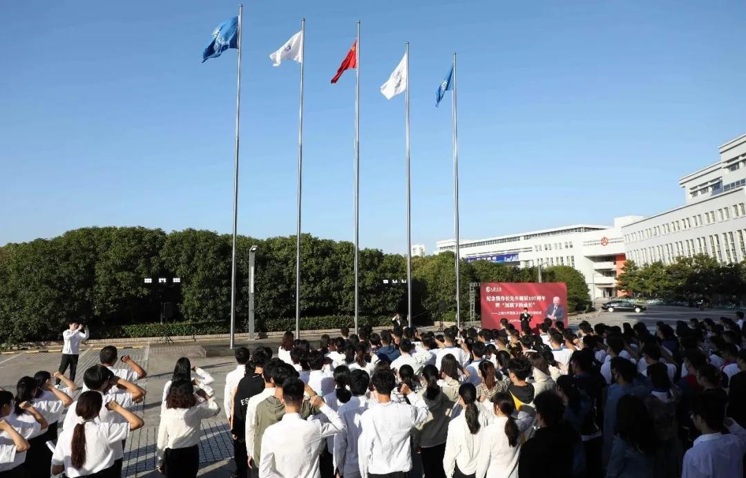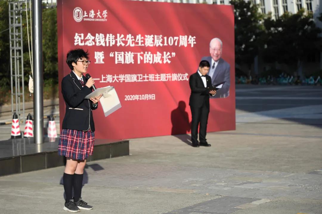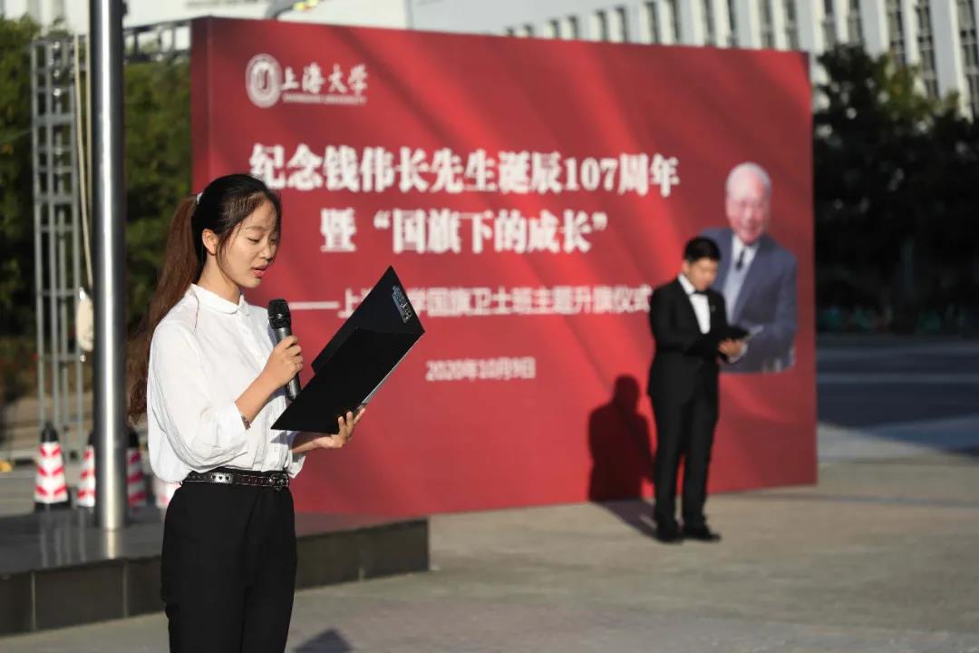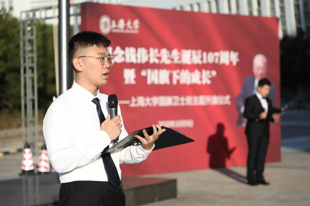 升旗仪式伊始,国旗卫士班旗手代表护送国旗入场,在全体师生的注视下,进行了庄严而肃穆的升旗仪式。仪式上,钱伟长教育思想员工宣讲团的代表李振东同学为大家带来了关于钱伟长教育思想的演讲《追忆伟长,我们共同前行》,与大家分享了钱老董事长的家国情怀以及他对上大学子的殷切嘱托,让在场的每一位员工都深受感染。