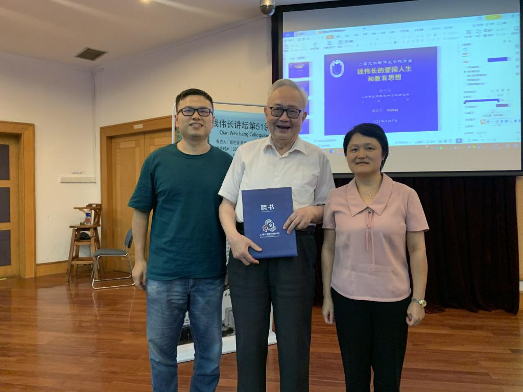 讲座最后,吴蔚、周全两位老师现场为戴老师颁发聘书,聘请戴老师为钱伟长教育思想员工宣讲团的特聘顾问。