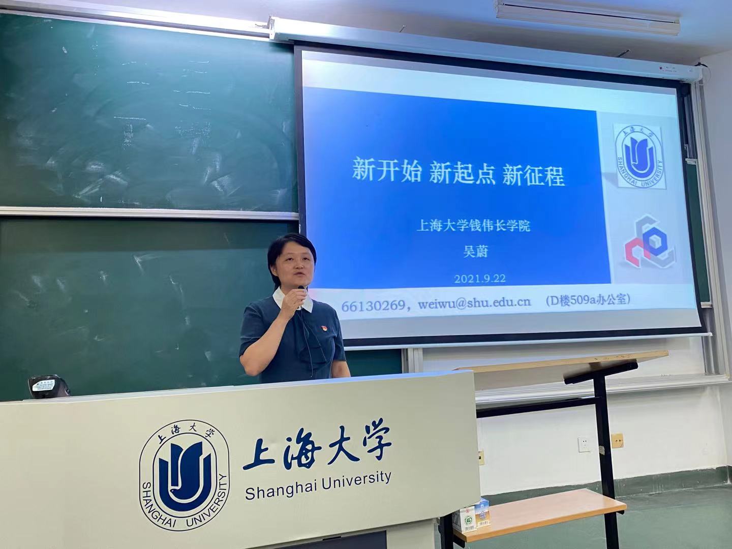 开篇,吴老师解读了伟长学子理应具有自强不息的基本素养以及自信坚韧的内在气质,随后以互动的方式介绍了2021级新生录取通知书盲盒设计的9种校徽颜色,从而引出此次课程的主题:大学与高中有什么不同?我们为什么从五湖四海而来到上大?我们在上大又该怎么发扬伟长精神?这些问题引导着每一位来到上大的新生去思考:我们的梦想是什么?我们应该如何去奋斗?在互动的过程中,吴老师以巧妙的问题让同学们意识到,大家已经不再是被动地接受知识,而是要主动追求和探索。吴老师希望同学们能够发挥自身的主观能动性,充分认识角色与身份的转变,以自主、自律、自信的姿态走好大学第一步。
