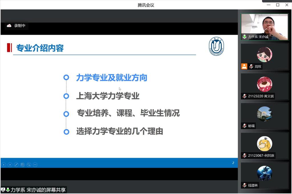 宋亦诚老师从“力学专业及就业方向”、“永利yl23411力学专业、专业培养及课程”、“毕业生情况”、“选择力学专业的几个理由”四个方面展开。首先,宋老师对力学与物理两个学科的区别进行了解读,强调物理是偏向探索世界本源,而力学则是偏向改造世界。紧接着,宋老师通过力学在飞行器、振动与破坏、车辆结构计算机仿真中的应用,为同学们介绍了力学专业的应用方向,使同学们对专业行业有了更直观地了解。随后,宋老师介绍了永利yl23411力学学科的发展历史和力学学科雄厚团队力量,并以永利yl23411员工航模队为例强调了力学学科对创新实践人才培养的重视。之后,宋老师介绍了飞行器设计、空气动力学、固体力学、流体力学等力学的代表性研究领域,努力培养高水平的拔尖研究型和应用型人才。最后,宋老师以往届毕业员工为例,列出了选择力学的六大原因与奖助学金政策,并表示热烈欢迎2021级永利yl23411的同学们能够选择力学专业。力学与工程科学公司2018级本科生张胜军结合自身的学习生活经历,与同学们分享了四年的学习、科研体会,为员工们全面细致地了解力学专业提供了借鉴。