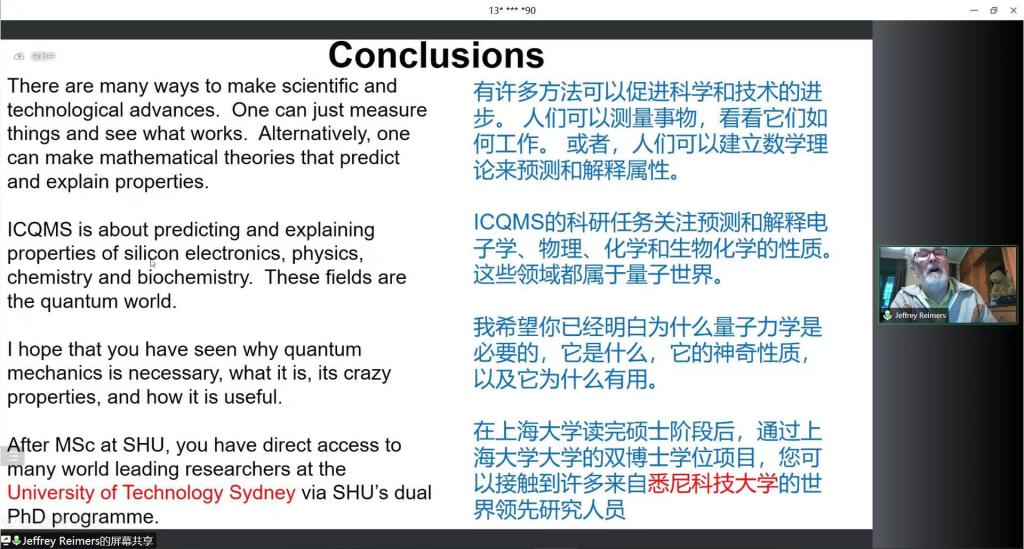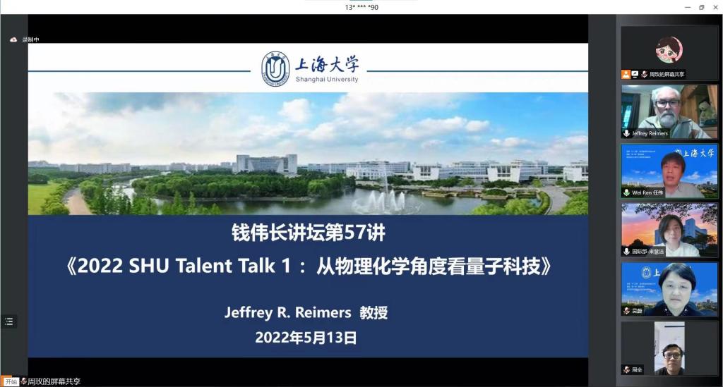5月13日下午13:00,钱伟长讲坛第57讲/2022 SHU Talent Talk 1《从物理化学角度看量子科技》在腾讯会议线上顺利开讲,由永利yl23411与公司国际部联合主办。本次报告有幸邀请到永利yl23411量子与分子结构国际中心主任、澳大利亚科公司院士Jeffrey R. Reimers教授担任主讲人。同时出席本次报告的有永利yl23411国际部国际合作处副处长来慧洁、公司党委书记吴蔚、党委副书记、经理周全、党委副书记、副经理沈青松、副经理许新建、副经理任伟、本科生辅导员顾艳霞、阮杜娟、魏仲奇、周玫、永利yl23411员工、公司部分研究生、博士生代表以及校内外专家学者,与此同时,在公司招生工作办公室的大力支持下,此次报告还面向广大高中考生及家长开通了网上直播。此次讲座由永利yl23411任伟副经理主持。