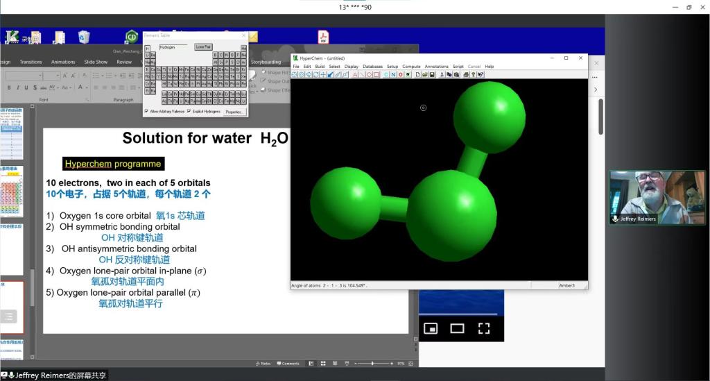 随后,Jeffrey Reimers教授向大家展示了根据波动方程将经典哈密顿方程转换为薛定谔方程的过程,并由此阐释了海森堡不确定性关系及狄拉克方程。Jeffrey Reimers教授由氢原子波函数引出对原子核外轨道和元素周期表的解释,并通过运行软件向大家现场演示了利用原子、分子的物理信息搭建氢原子、水分子的过程,生动地展现了利用现代软件求解薛定谔方程来模拟分子、原子行为以及进行性质研究的过程,给大家留下了深刻地印象。此外,Jeffrey Reimers教授还简要介绍了利用现代模拟软件和量子力学对光合作用系统的研究情况。