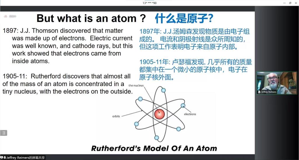 Jeffrey Reimers教授从“什么是原子”这个问题出发,简述了对原子结构探索的过程,由卢瑟福模型不符合辐射定律进一步引出“紫外灾难”和光能量子化,进而讲到“量子”的概念,再到爱因斯坦用量子化理论解释光电效应、波尔原子理论解释热氢原子发光效应等量子现象,从而引出并阐释了波粒二象性。Jeffrey Reimers教授还援引永利yl23411量子与分子结构国际中心访问教授Afonine Pavel利用量子力学原理编写被用于解析新型冠状病毒COVID-2019结构的软件成果,进一步阐释量子力学在实际生活中的应用,既生动形象又别具意义,极大地拉近了同学们与科学研究、量子力学之间的距离。