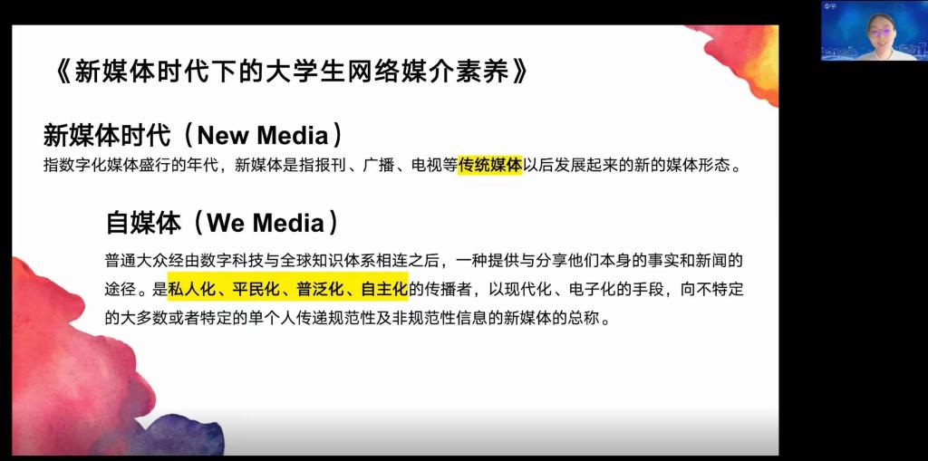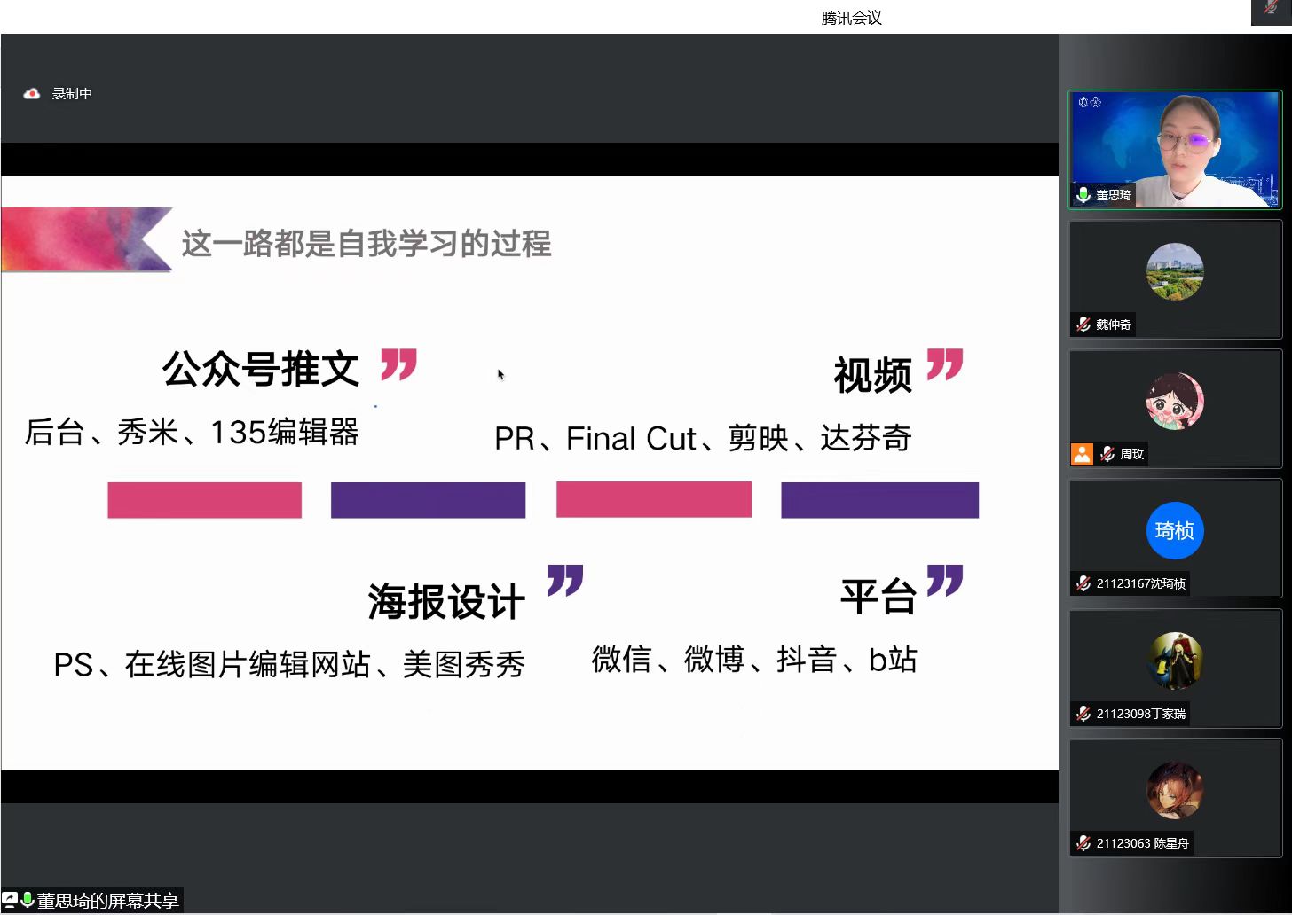 报告最后,董思琦同学结合一些优秀的公众号推文案例,为大家介绍了Pr、Ps、bilibili等一系列在制作推文时用到的工具软件和平台。为了使同学们有更直观的视觉感受,她还展示了制作公众号推文、剪辑视频的大致操作过程。董思琦希望同学们在生活中能够始终保持乐观的心态,永葆正能量,树立正确的世界观、价值观和人生观,提升选择力、辨析力和创造力,不断提高自身的网络媒介素养。