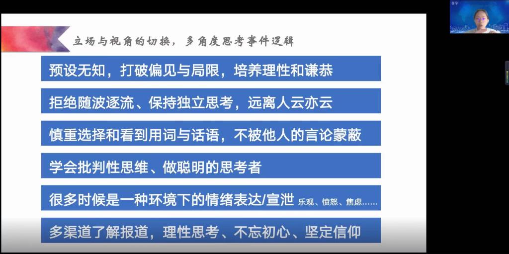 接下来,董思琦同学从发布者和传播者的角度诠释了信息传递中的角色变化。她认为,由于受众在传播信息的过程中,会对信息进行主观加工,因而,信息的传播者也会成为信息的二次发布者,所以两种角色之间并不是泾渭分明的。此外,关于是否要为某一热点事件发声,董思琦结合唐山事件等案例分析了在浏览网络热点信息时应该注意的事项,即需要考虑时间成本、情绪成本、法律法规以及对人际关系的影响。董思琪同学结合《批判性思维》这本书,建议同学们要预设无知,打破偏见与局限,培养理性和谦恭,鼓励同学们保持独立思考,学会批判性思维和理性思考,努力做聪明的思考者。
