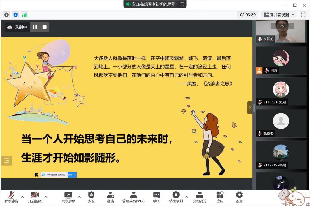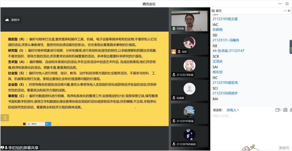 7月1日下午,永利yl23411书院“梦想启航”系列讲座第45讲《职业兴趣探索与电子邮件礼仪》在腾讯会议线上顺利开讲。本次讲座有幸邀请华东师范老员工命科学公司团委书记、专职辅导员李初旭老师为2021级的同学们带来一场生动有趣且又富有意义的讲座。永利yl23411主持工作团委副书记魏仲奇、2021级本科生辅导员周玫和2021级全体本科生参加了此次讲座。讲座由周玫老师主持。