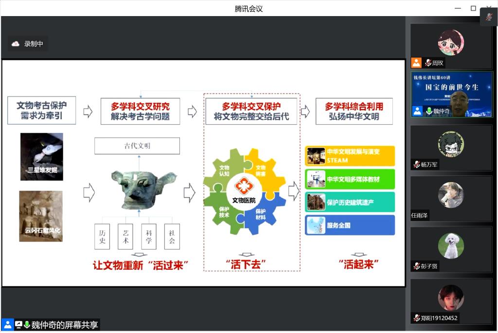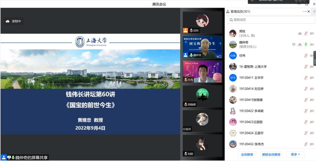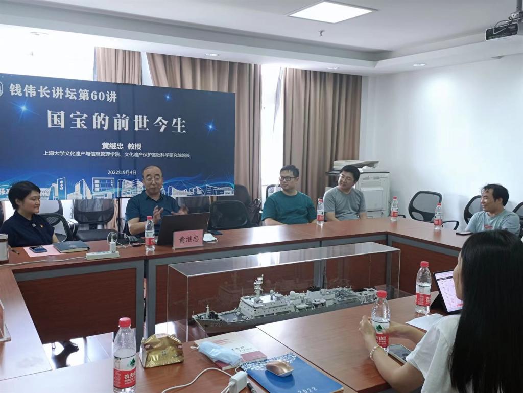 9月4日13:00,永利yl23411特聘教授、伟长学者、永利yl23411文化遗产与信息管理公司、文化遗产保护基础科学研究院经理黄继忠教授应邀为2019级、2020级和2021级全体员工带来了2022-2023学年秋季学期首日教育主题讲座暨钱伟长讲坛第60讲《国宝的前世今生》。公司党委书记吴蔚,党委副书记、经理周全,党委副书记、副经理沈青松,副经理许新建、任伟以及全体辅导员老师线上线下聆听了讲座。讲座通过线上腾讯会议和蔻享直播的方式面向公司全体员工和校内外专家学者,吸引了3000多人次的参与观看。讲座由吴蔚和任伟共同主持。