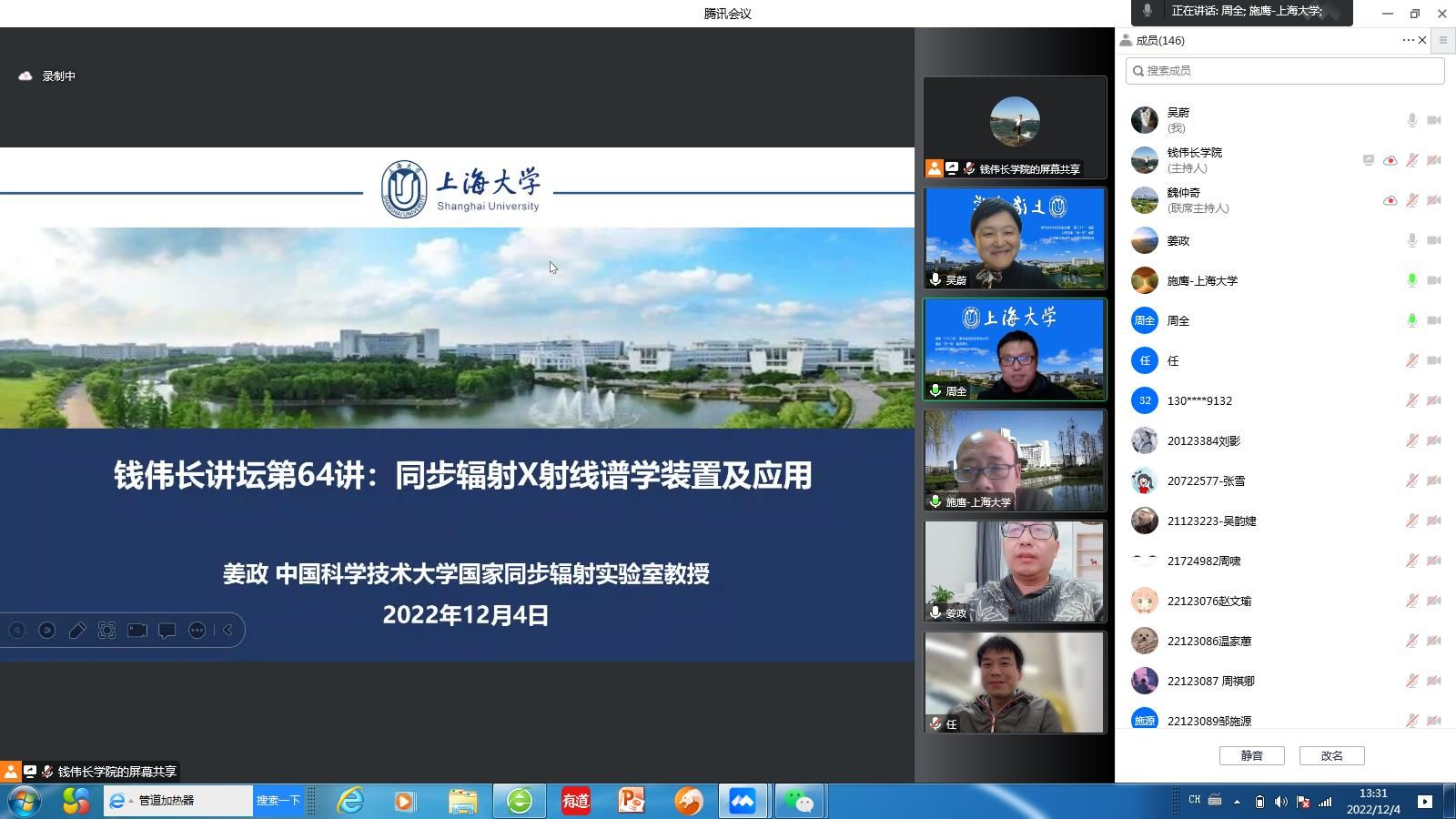 2022年12月4日下午13:30,钱伟长讲坛第64讲《同步辐射X射线谱学装置及应用》于线上顺利举行。本次讲坛有幸邀请到中国科学技术大学国家同步辐射实验室姜政教授担任主讲。校学术委员会秘书处秘书长施鹰,公司党委书记吴蔚,党委副书记、经理周全,党委副书记、副经理沈青松,副经理任伟以及公司师生共同聆听了讲座。此次讲座还通过线上腾讯会议和蔻享直播的方式吸引了校内外专家学者、师生等1600余人在线观看。讲座由永利yl23411周全经理主持。