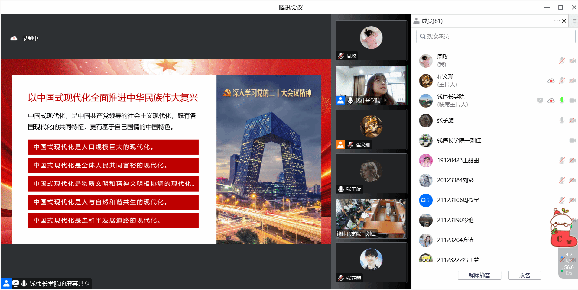 报告最后,袁老师指出,党的二十大报告的十五个部分体现了党的百年奋斗历程,也是中国共产党百年理论创新历程的生动展现。此次专题学习进一步加深了公司师生对党的二十大报告精神及中华优秀传统文化的理解和认识,大家纷纷表示,不仅要继续认真学习党的二十大报告内容,更要贯彻好党的二十大报告精神,并在学思践悟中强化担当作为,坚持讲好中国故事,传播好中国声音,为推动中华文明走向世界贡献力量。(撰稿:袁可歆)
