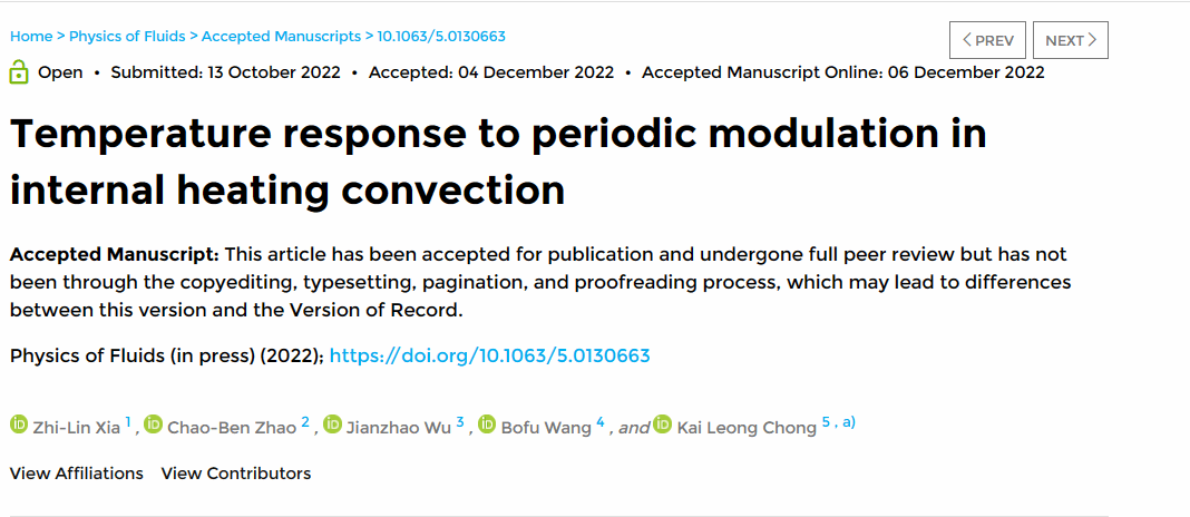 在专业学习期间,力学与工程科学公司的庄启亮等教授激发了夏智霖同学对流体力学的科研兴趣,自大三年级起,夏智霖正式进入庄启亮教授课题组开展科学研究。在学业导师的悉心指导下,夏智霖同学以第一作者在流体力学国际知名期刊Physics of Fluids发表论文《Temperature response to periodic modulation in internal heating convection》。