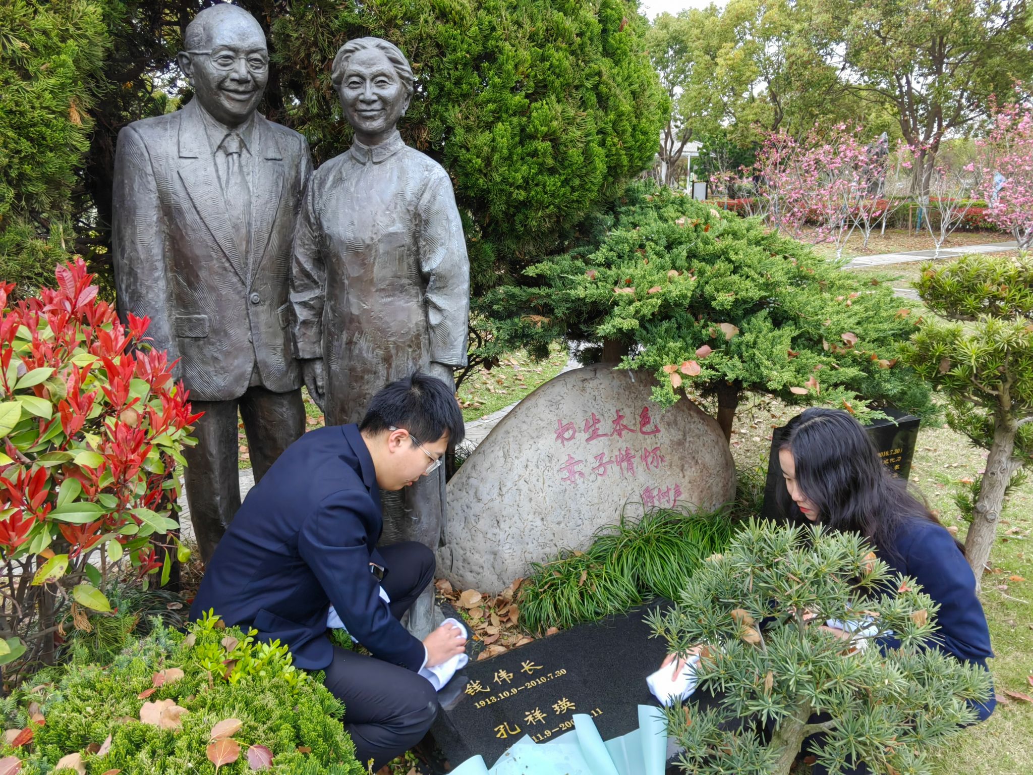 活动伊始,2023届毕业生任雨泽、王语嫣同学用白毛巾轻轻地擦拭钱伟长老董事长夫妇的铜像和墓碑,并除去墓碑周边的杂草与枯叶,每一个细微的动作都表达了对钱伟长老董事长夫妇深深的怀念之情。
