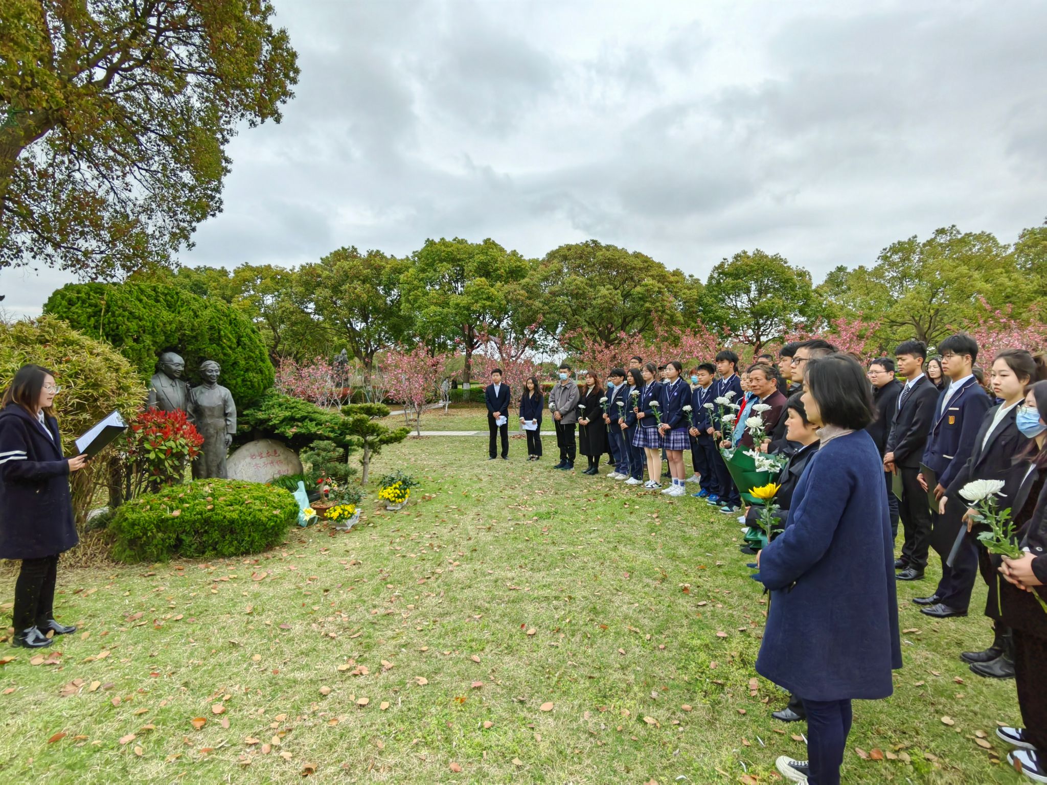 缅怀仪式上,在钱伟长老董事长夫妇的墓碑前,老师同学们依次鞠躬致敬并敬献鲜花,以表达对钱伟长老董事长的无比敬仰和深切的怀念。