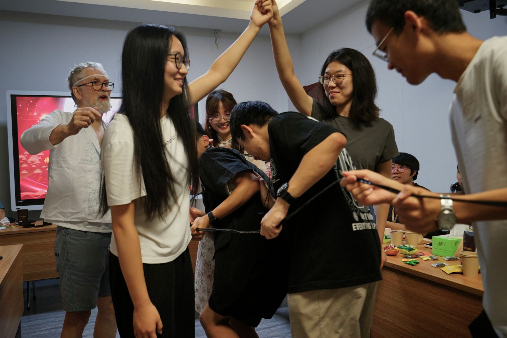 活动从大家依次自我介绍开始,在此过程中,老师们与同学们增进了相互了解,欢声笑语充满会场。作为本次活动的特邀嘉宾,Jeffrey教授特意换上古装以契合活动主题,同时,教授也准备了道具,邀请八位同学根据他的指示进行演示,用游戏的方式生动地向大家呈现了自己的学科研究方向,引发了现场师生的浓厚兴趣。