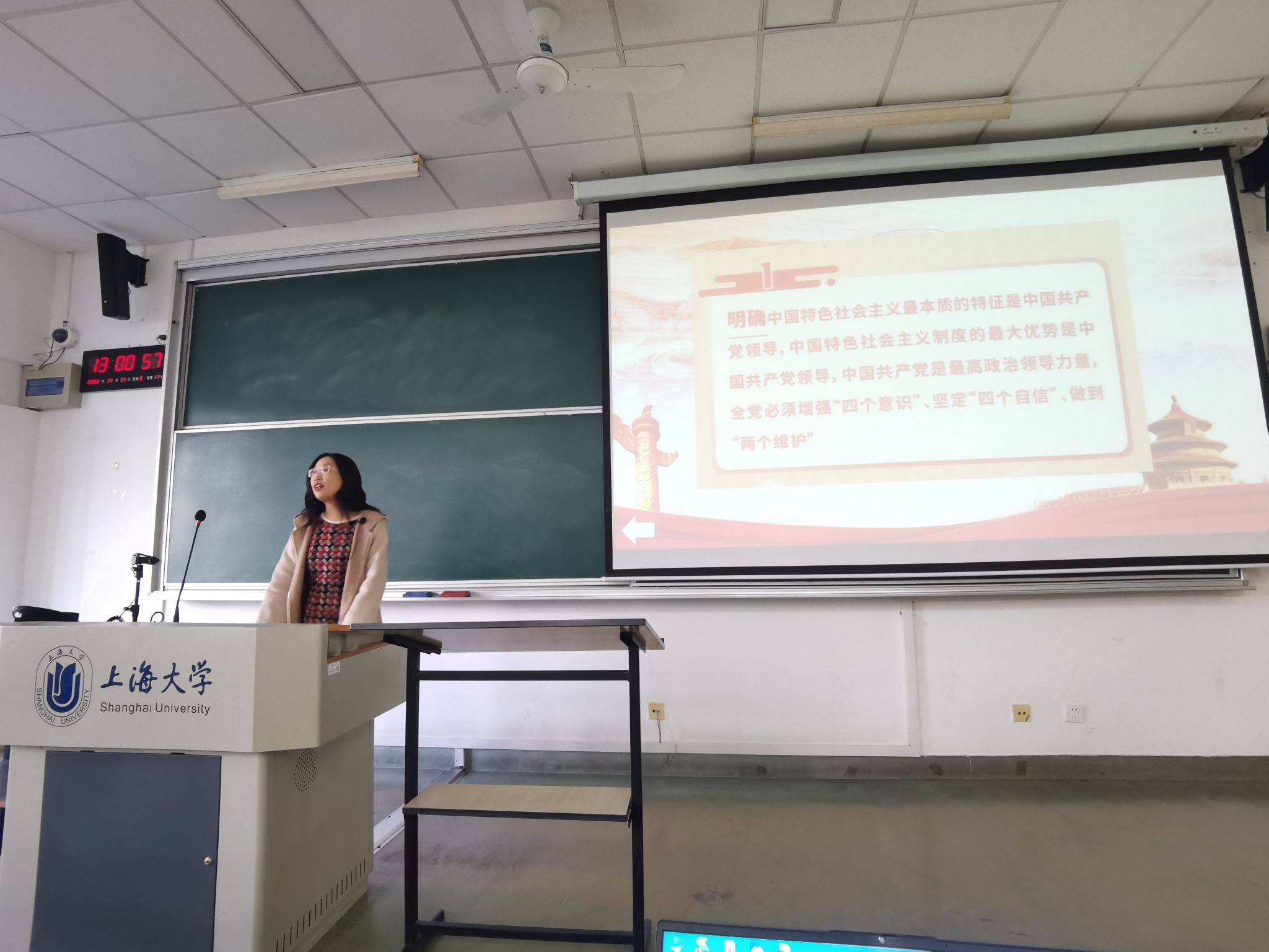 党课伊始,申老师引用了习近平总书记在《毫不动摇坚持和加强党的全面领导》一文中强调的“中国最大的国情就是中国共产党的领导”这一观点,明确了中国特色社会主义最本质的特征是中国共产党的领导,并指出这是习近平新时代中国特色社会主义思想的主体内容“十个明确”中的第一个明确。随后,申老师详细阐述了全党必须牢记的“五个必由之路”,再次重申了中国共产党的领导关系着中国特色社会主义的性质、方向和命运。接着,申老师为师生党员们逐一阐释了中国特色社会主义制度的“十三大优势”,随后指出中国特色社会主义制度优势来源于中国共产党自身的优势,并通过播放观看《中国共产党百年述职报告》视频、分享互动等方式,逐一分析了中国共产党的“五大优势”,使得同学们更为深刻地理解并进一步坚定了“中国共产党的领导是中国特色社会主义最本质的特征”这一观点和立场。