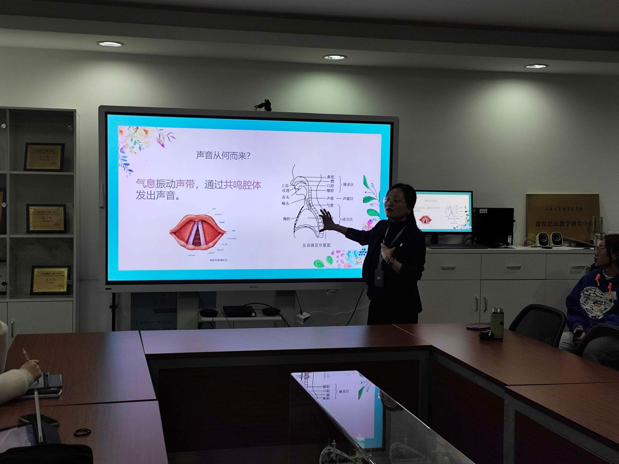 活动伊始,姜芬芬老师介绍了提升说话艺术与魅力的内部技巧。从声音产生的原理入手,姜老师为同学们介绍了发声基本功——气息、发声、吐字归音的训练,并在活动上展示了一些具体的训练方法。