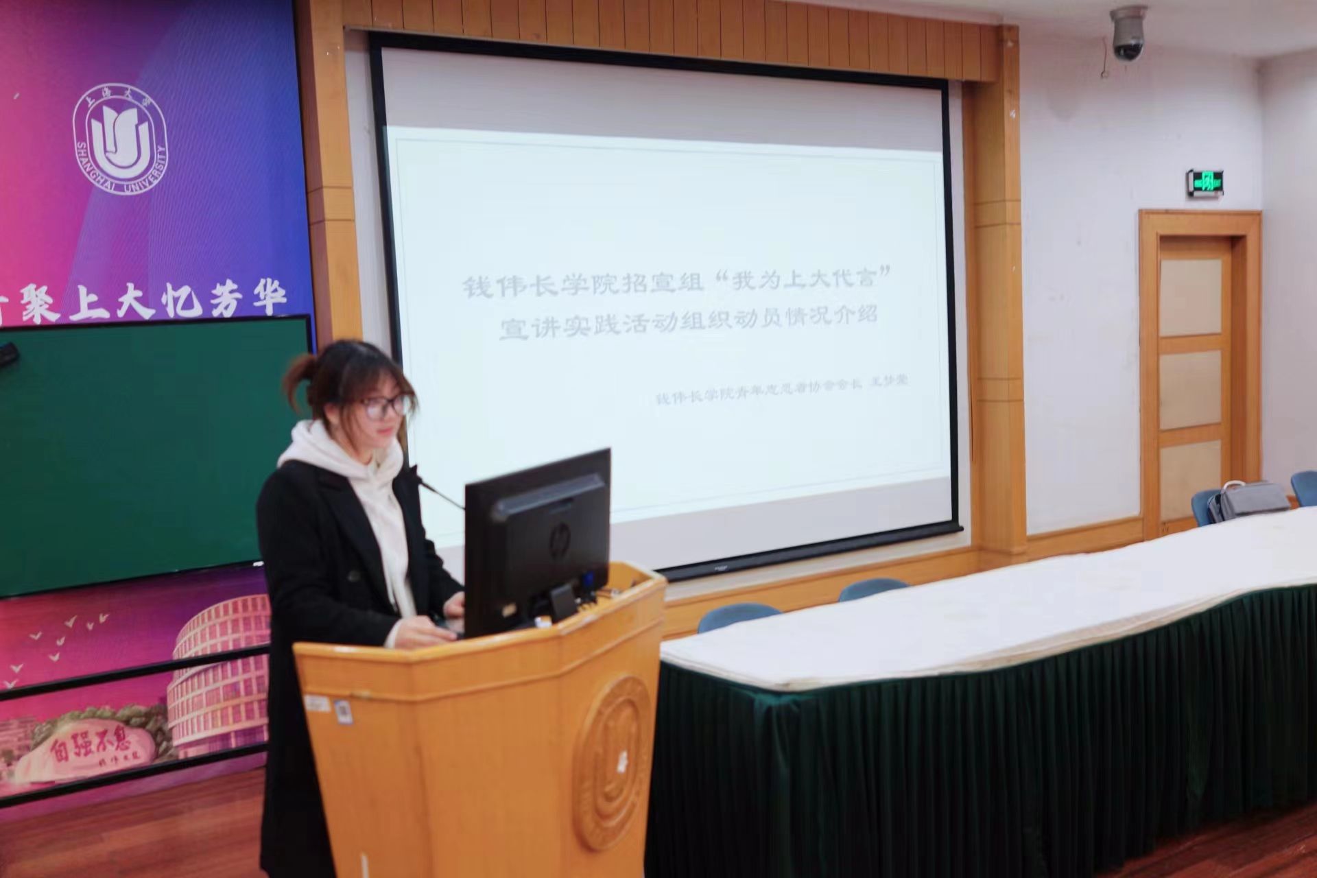 随后,永利yl23411青年志愿者协会会长王梦莹介绍了“我为上大代言”活动组织动员情况。近年来永利yl23411在招生宣传的过程中,充分整合公司团委相关资源服务招生宣传工作,高度重视建立员工志愿者队伍,精心组织安排了来自相关省份的优秀学子代表,在各相关省份的招宣活动过程中全程做好跟踪保障,同时为员工培养交流表达能力创造机会。近几年,涌现出连续四年参加河南招宣的“招宣老兵”李振东同学、校本科招生宣传协会会长、永利yl23411首届“招生宣传大使”代玟同学等一批精干力量。本年度共有50名同学通过报名,其中2021级5人、2022级9人、2023级36人。招宣志愿者们将在寒假期间分赴10个省、直辖市,在各省招宣组的统一部署下,回家乡、回母校,面向46所高中开展招生宣传志愿服务。后续院青志协将持续做好跟踪服务,记录、整理各省招生宣传志愿服务的开展情况,助力志愿者们高效开展志愿服务。