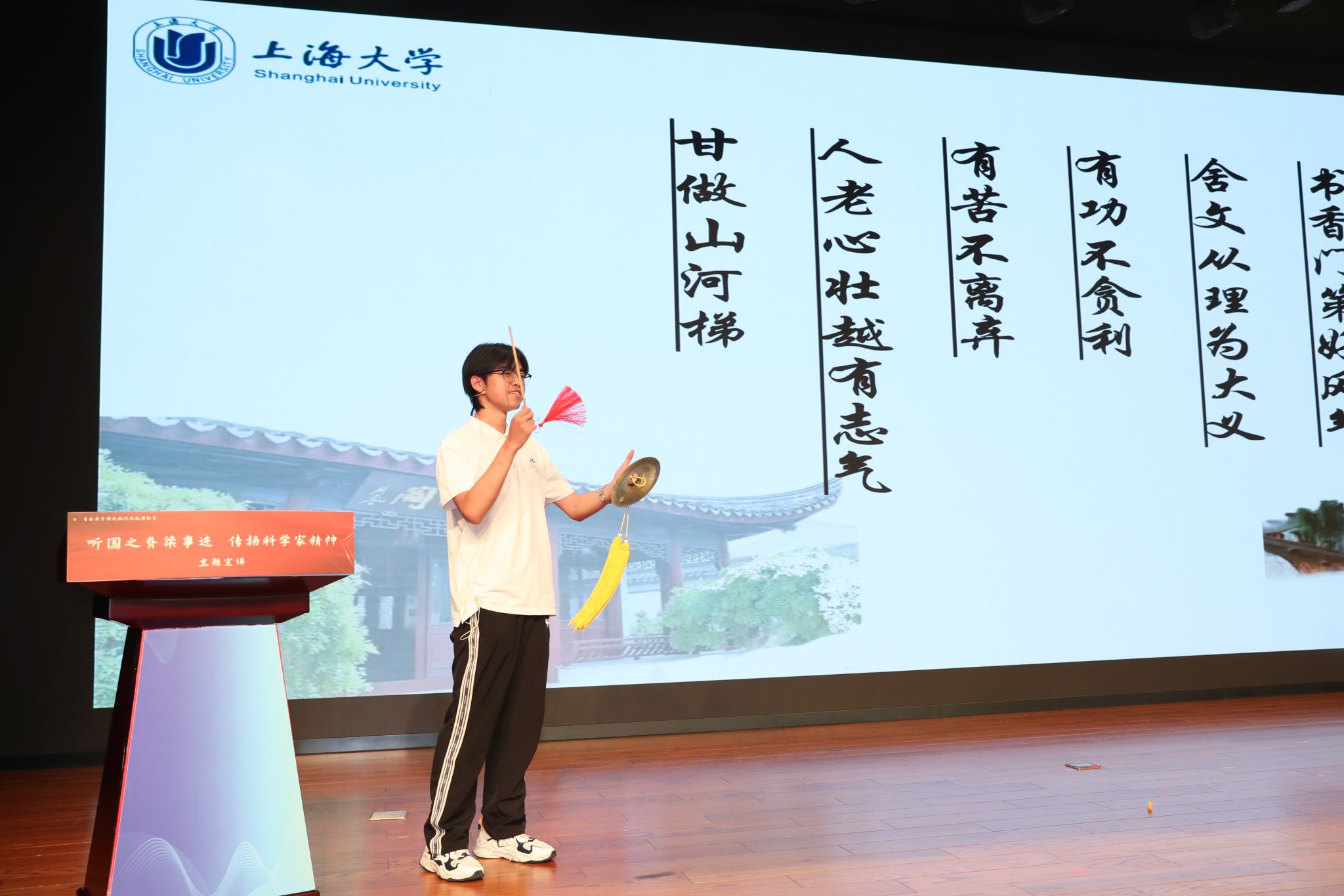 来自上海钱伟长教育理念员工宣讲团的金轶明结合曲艺生动讲述了钱伟长一生践行“国家需要就是我的专业”,从弃文从理科学救国,到留学归国攻坚克难,再到逆境中坚持科研创新,他始终将个人理想融入国家发展。其“无名无利无悔,有情有义有祖国”的精神,诠释了赤子报国的科学人生,深深震撼了现场及线上近2000名沪兴两地青年。